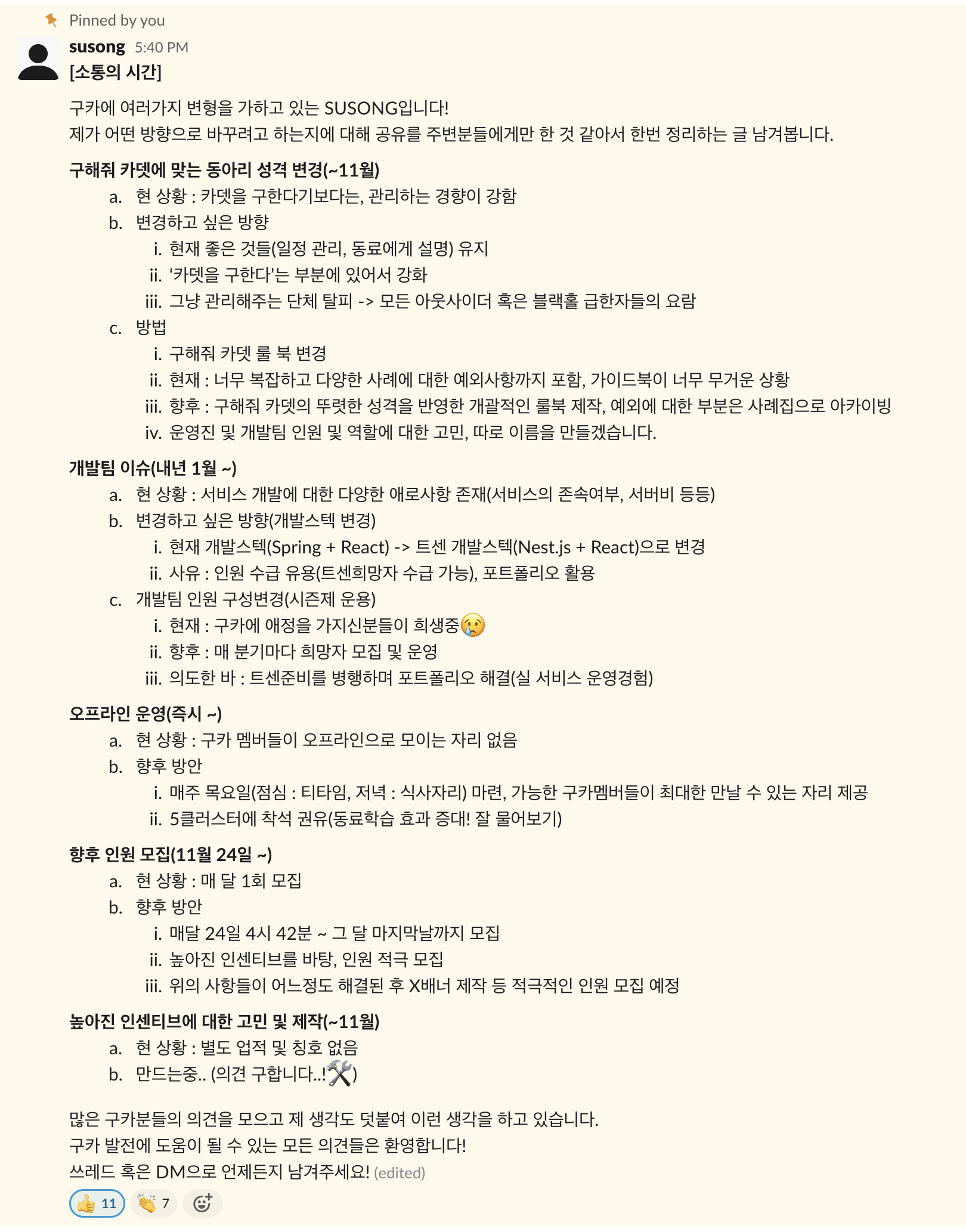 나는 내가 처음 적을 둔 이 동아리가 진심으로 망하지 않았으면 좋겠다고 생각했고, 동아리의 혁신 혹은 부활을 위해 전체인원 소집을 제안했다.
