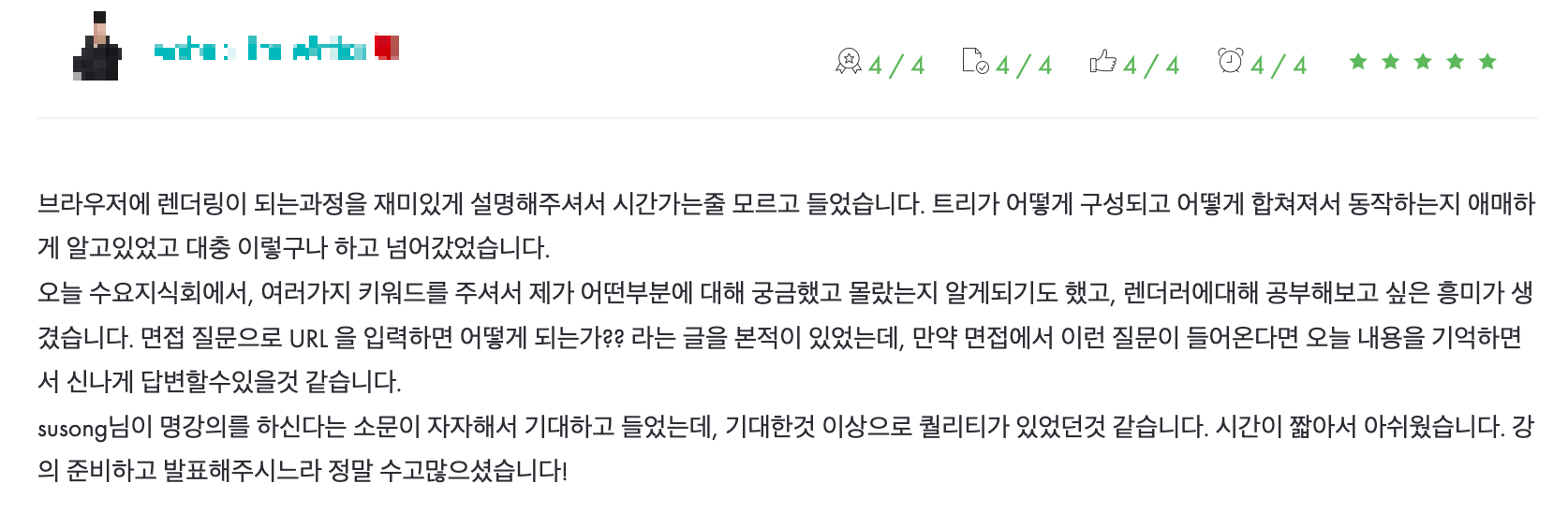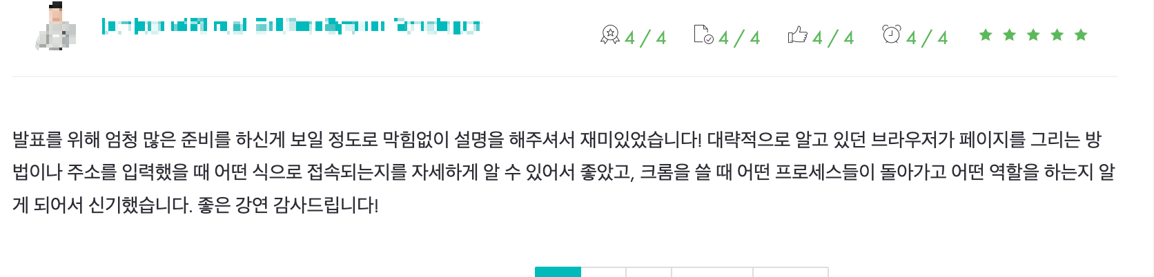 이번 발표도 예외는 없다. 내 강의를 보러 온 모든 사람은 나에 대해 평가할 수 있었고, 나는 5.0점 만점에 5.0의 점수를 받았다. 피드백 중에 인상 깊었던 내용들은 아래와 같다.
