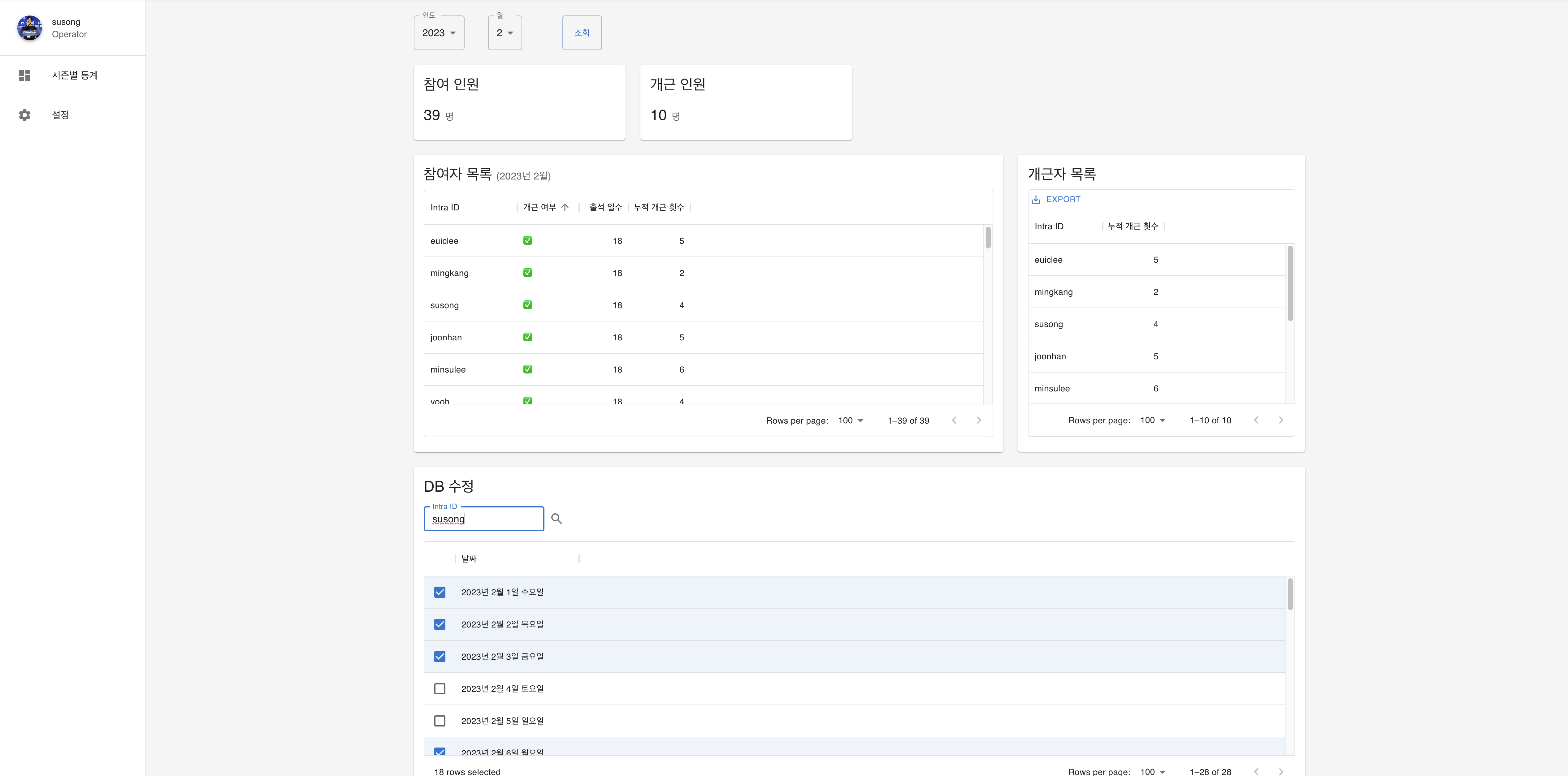 출석 사이트 말고도, 통계를 확인할 수 있는 대쉬보드도 제작하여 운영진의 피로도가 줄었다.