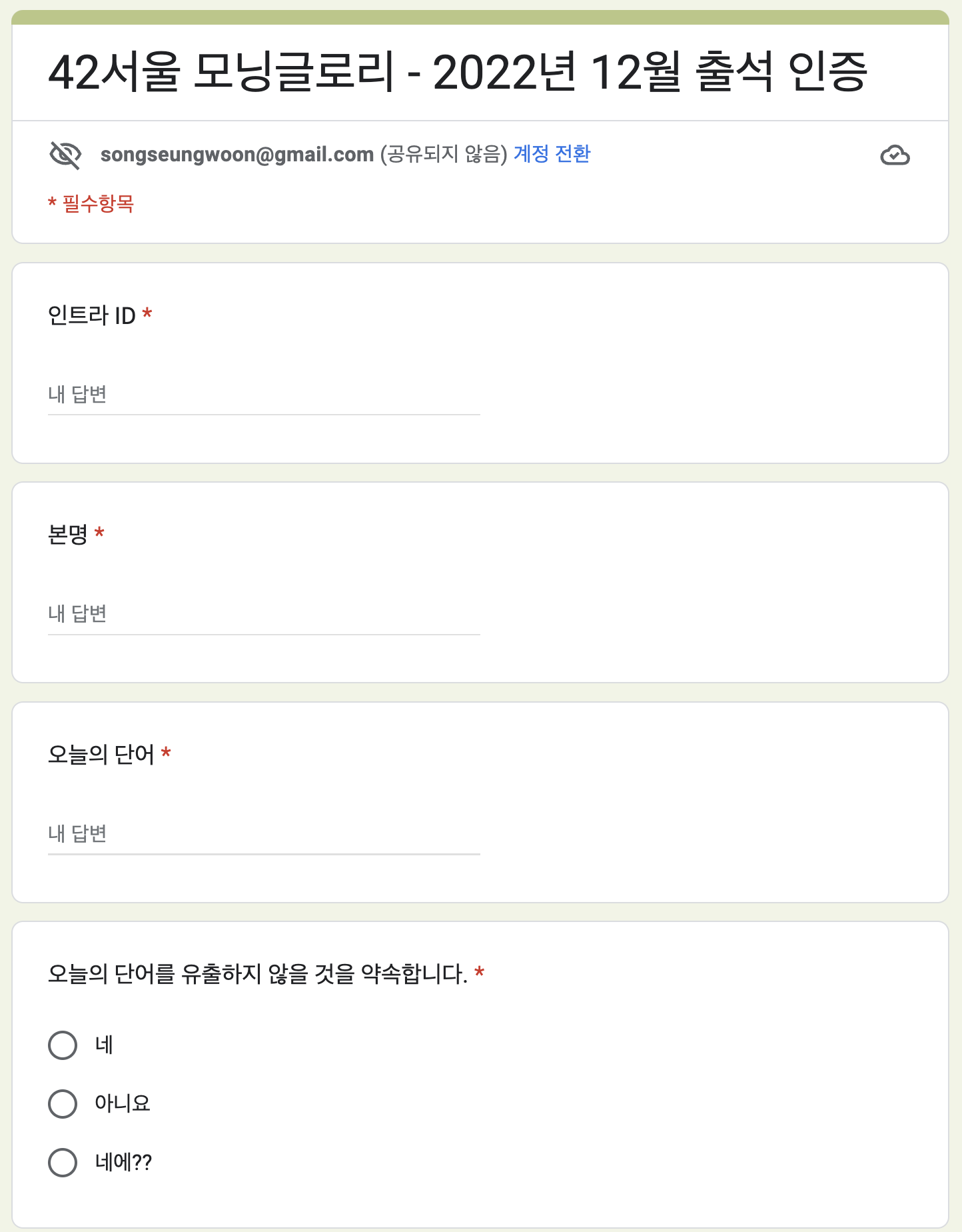 두번째 방식은 구글 폼을 사용하는 방법이었다. 이 방법을 통해 사람들의 수를 효율적으로 파악할 수 있었고, 분실의 위험과 인식의 문제는 조금 줄었다(인식의 문제는 여전히 존재했다. 특히 오타를 내거나하면 스프레트 시트 함수식에 인식이 안되는 문제 등등..) 해당 자료는 스프레드 시트를 통해 유지가 되었고, 어느정도 첫번째 문제를 해결한 상태에서 잘 진행되는 것처럼 보였다. 하지만, 개월수가 늘어나며 다루어야하는 데이터가 많아지고, 특히 인트라 ID오타나 오늘의 단어 오타로 인하여 소수의 진행자들에게 많은 일손이 부여되었다. 이렇게 소수의 진행자들이 고생하는 모습을 보며 많은 사람들은 진행자들을 자처하기 꺼려했고, 모닝글로리에 애착을 가지고 있는 사람들은 문제를 해결할 방법을 찾기로 결심한다.