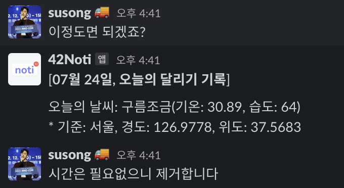 42서울에는 달리기 기록을 올리는 채널이 있다. 그런데 잘 살펴보면 이 채널에 사람이 매일 날짜를 올리고 그 아래에 쓰레드를 통해서 사람들이 자신의 달리기 기록을 인정받는다. 개인적으로 날짜 치는 것이 귀찮을 것이라고 생각했고, 그래서 채널을 위해서 간단한 날짜 봇 및 날씨를 알려주는 봇을 만들었다. 이번에는 다른 회고와 다르게 실제로 어떻게 만드는지도 설명해볼까 한다.
